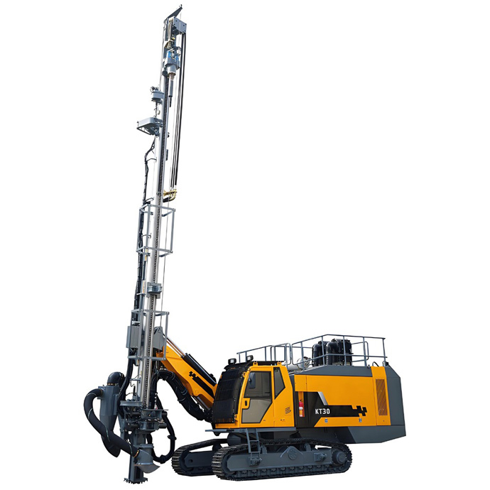 The KT30 integrated down the hole drill rig for open use can drilling vertical and inclined holes, mainly used for open-pit mine, stonework blast holes and pre-splitting holes. It is driven by the Cummins diesel engine and the two-terminal output can drive the screw compression system and hydraulic transmission system. The drill rig features aluminum guide rails for excellent drilling straightness, the two-stage screw compressor for enhanced air system stability, and long drill pipes to reduce rod-changing frequency. The drill rig is equipped with the drill pipe lubrication system, dry dust collection system, drill thread protection, drilling angle/depth display, automatic rod handler to reduce labor intensity, air-conditioned cab for comfortable operation, and auto-controlled anti-jamming valve to minimize sticking risks.